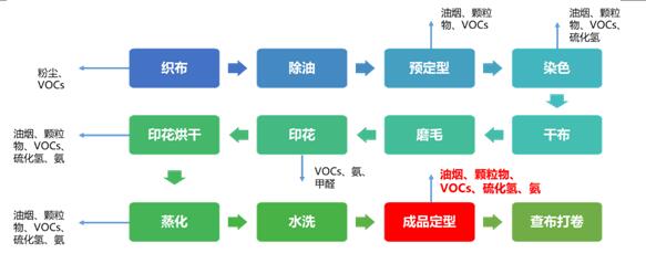 紡織印染生產工藝流程大致分為布準備及前處理、染色、印花、后整理及成品包裝四個階段。由于加工布料的差異,工藝稍有不同,往往需要多種原料,通過多個組合工序進行生產,VOCs排放幾乎涉及了所有的排放環節。成品定型階段是防治印染行業排放量最大的加工環節,其排放來源于使用高溫定型機導致的溶劑揮發