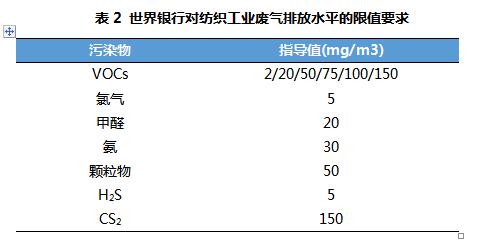 國際上,不同國家、不同地區針對紡織工業大氣排放標準有不同的約束條件。其中,世界銀行的《防治印染行業廢氣排放水平標準》列出了揮發性有機物VOCs)、氯氣、甲醛、顆粒物等主要污染因子的限值,這與我國紡織工業廢氣排放種類基本相同,可作為紡織印染行業的重要技術參考。