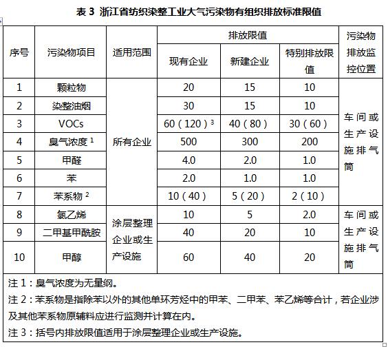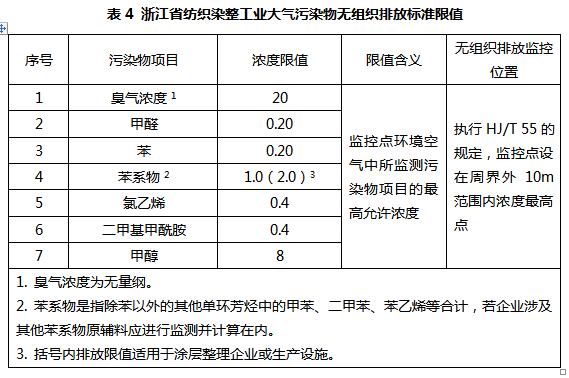 目前我國印染行業大氣污染物排放標準正在制定,國內只有浙江省頒布了《浙江省紡織染整工業大氣污染物排放標準》(DB33/962-2015),其他省份地區目前仍在執行《大氣污染物綜合排放標準》或當地的大氣污染綜合排放標準。